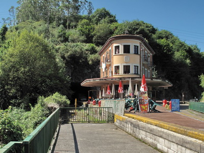 Blick zurück zum alten Bahnhof, heute eine Gaststätte. Über den Río Nalón führt ein großes Viadukt.