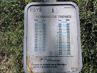 Der alte Fahrplan hängt noch in seinem Kasten: Stündlich verkehrten die Züge der FEVE von 06:54 bis 21:40 Uhr! Davon kann man auf manchen Bahnstrecken heute nur träumen. Allerdings brauchte der Zug für die 8 km 35 Minuten, entsprechend etwa 14 kmh! Talwärts ging es etwas schneller (19 kmh). Unsere Fahrt geht ebenfalls zügig bergauf.