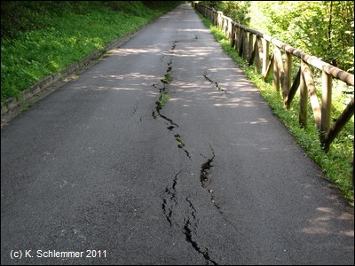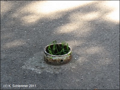An der folgenden Kreuzung haben die Radler ein Stoppschild! Die Reste eines Sperrpfostens ragen aus dem Boden.