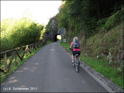 Auf asphaltierter, ebener Strecke geht es kaum merklich bergauf. Schon folgt der erste von vier Tunneln: Túnel del Venero, sehr gut beleuchtet.