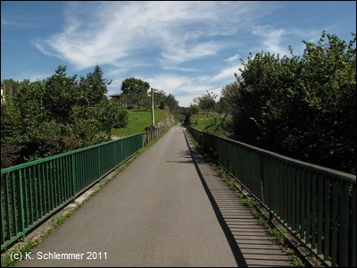 Eine alte Brücke überquert die Trasse, dann eine neue Straßenbrücke.