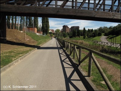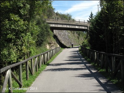 Etwas verwirrend für den ortsfremden Radler sind die Beschilderunen der asturianischen Vias Verdes. Am alten Bahnhof Fuso de la Reina endet die Via Verde Tuñon - Fuso de la Reina, manchmal auch als Teil des Radwegs Senda del Oso ausgewiesen. Es beginnt die Vía Verde de Fuso auf der stillgelegten Bahnstrecke nach Oviedo. Asphaltiert - wenn auch an einigen Stellen beschädigt - fährt man mühelos die rund 100 Höhenmeter vom Río Nalón in die Hauptstadt Asturiens. Vier Tunnel und ein großes Viadukt sowie fünf Brücken hat die 8 km kurze Strecke aufzuweisen. Die Fahrt endet im Parque de Invierno in Oviedo vor dem vermauerten Tunnel von San Lázaro Sur.