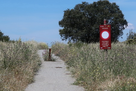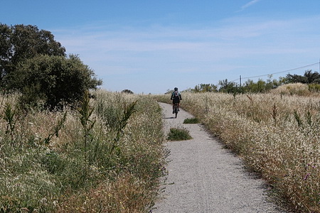 Es folgt ein Damm über den Arroyo del Haza, zur Zeit völlig ausgetrocknet. Die holprige Fahrbahn wird langsam wieder von der Natur erobert.