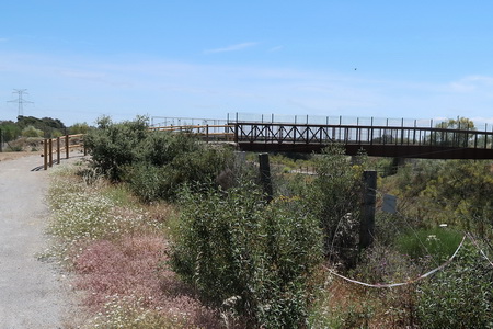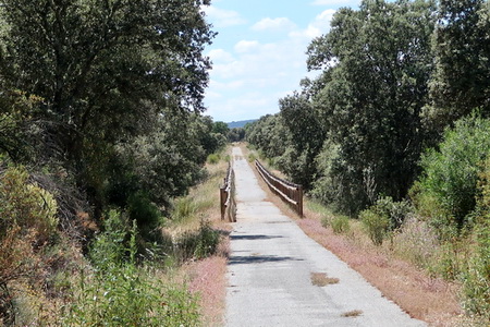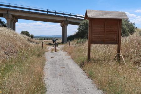 Kurz darauf ist das Ende der Vía Verde erreicht. Die Infotafel ist leer, auch ist kein Wegweiser in Sicht. Man muss vor der Brücke rechts abbiegen, durch einen Weidezaun (bitte Gitter wieder schließen!) und über die Brücke. Von dort aus erreicht man sowohl die Straße zum Fluss Tiétar (Carretera de las Urdimalas), als auch die Landstraße EX-108. Von der Brücke aus erkennt man noch die alte Bahntrasse, die in einem Bogen in die neue Bahnstrecke mündet.