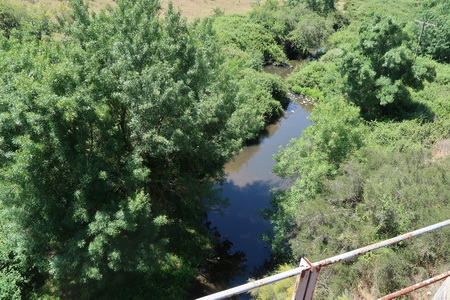 Das Wasser hat einen grünen Streifen in der sonst kargen Landschaft hervorgezaubert. Der Blick zurück zeigt den hohen Damm, der für den Trassenbau erforderlich gewesen war.
