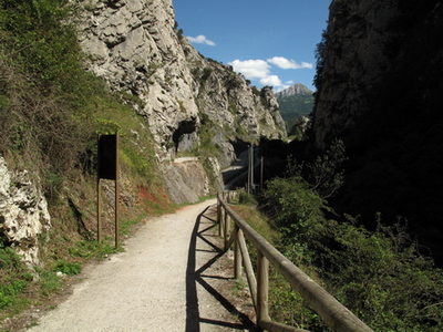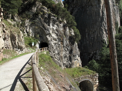 Die enge Schlucht von Valdemurio ist bald erreicht, ein erster kleiner Tunnel taucht auf. Die senkrechten Felswände trennen nur wenige Meter voneinander, das Nebeneinander der Bahntunnel und der Straßentunnel ergeben ein ungewöhliches Panorama.