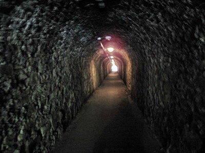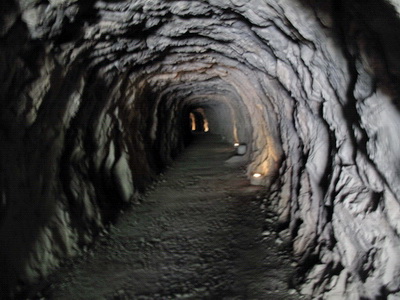 103 m lang ist diese Röhre, nur grob aus dem Felsen gehauen. Die Enge und die Dunkelheit wirken beklemmend - hier fuhren früher die Dampfloks der Minenbahn, wahrscheinlich blieb kaum Luft zum Atmen.