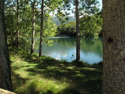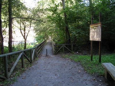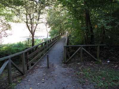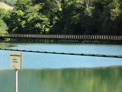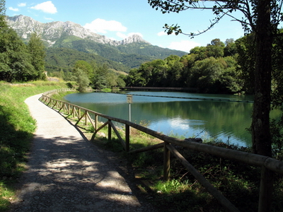 Die Berge am Horizont sind nicht die Alpen, sondern die Berge Asturiens! Ein langer Holzsteg bringt den Radler auf das andere Ufer des Sees.