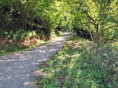 Das Ende der Schlucht ist schon in Sichtweite. Hier ist die Trasse wohl nicht mehr erhalten, ein schottriger Radweg folgt der Straße zum Stausee - evtl. auf die Straße ausweichen.