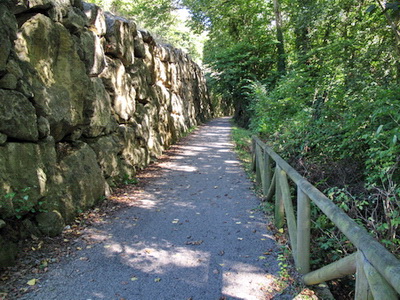 Über eine hölzerne Brücke, dann an der mächtigen Steinmauer entlang.