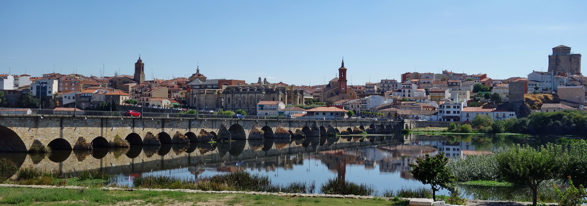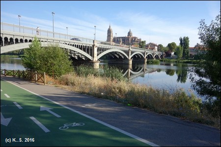 Salamanca (145.000 Einwohner) am Río Tormes, Provinzhauptstadt in der autonomen spanischen Region Kastilien-León, ist der Ausgangspunkt eines Radwegs auf einer längst stillgelegten Bahnstrecke. Viel weiter in die Vergangenheit, nämlich in die Zeit der Römer, reicht der alte Handels- und Pilgerweg, der als gepflasterter Weg über hunderte von Kilometern die Städte Sevilla - Merida - Salamanca und Astorga verband. Die spätere Bezeichnung "Vía (oder Ruta) de la Plata" (Silberweg) leitet sich wahrscheinlich von der arabischen Bezeichnung des Weges ab und nicht vom Silbertransport. Die alte Bahnlinie, die in ihrem Verlauf von Plasencia nach Astorga dieser alten Straße folgte, wurde zwischen Carbajosa de la Sagrada, am Rande der Stadt Salamanca und der Gemeinde Alba de Tormes (3.500 Einwohner) zu einem 20 km langen Radweg ausgebaut. Die Stadt Salamanca ist berühmt für ihre Universität, und der historische Stadtkern mit den beiden Kathedralen, dem Muschelhaus und dem alten Universitätsgebäude gehören zum UNESCO-Weltkulturerbe. Schon deshalb bietet sich die Stadt als Ausgangspunkt für eine Fahrt auf der Vía Verde de la Plata oder auch Camino Natural Vía de la Plata an.