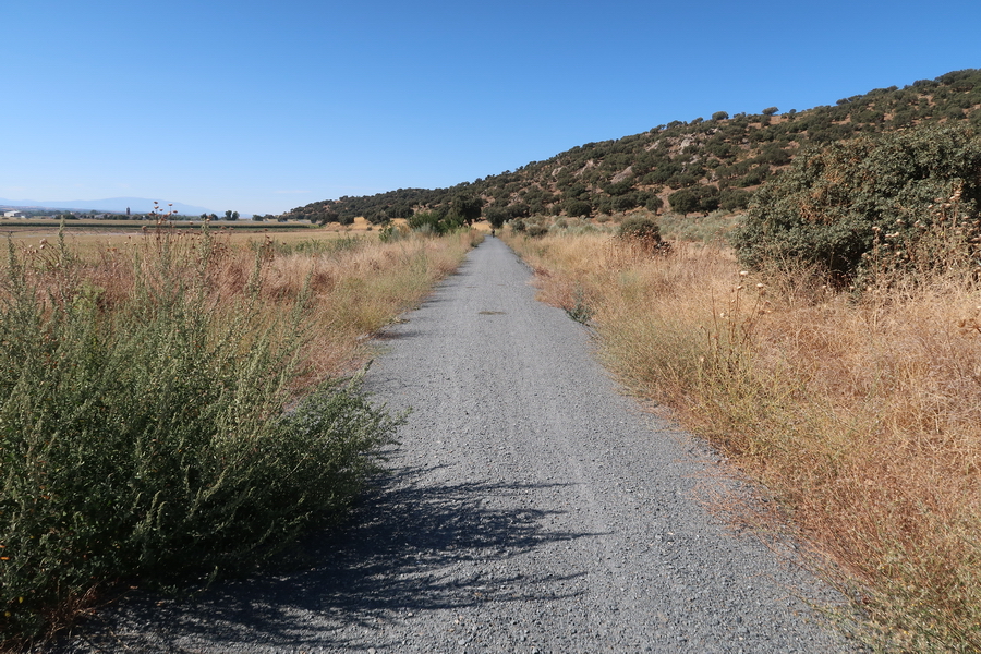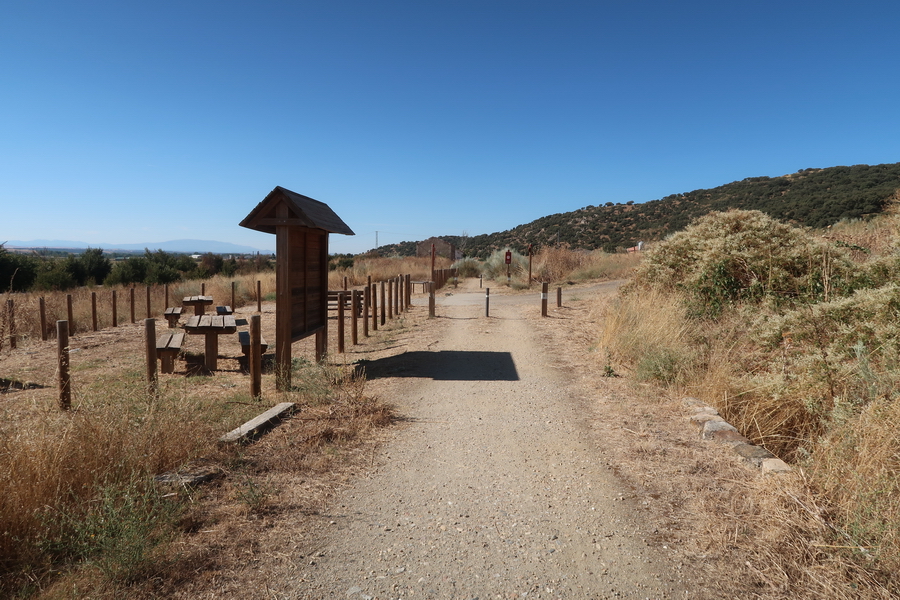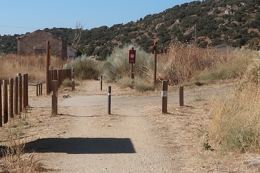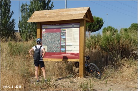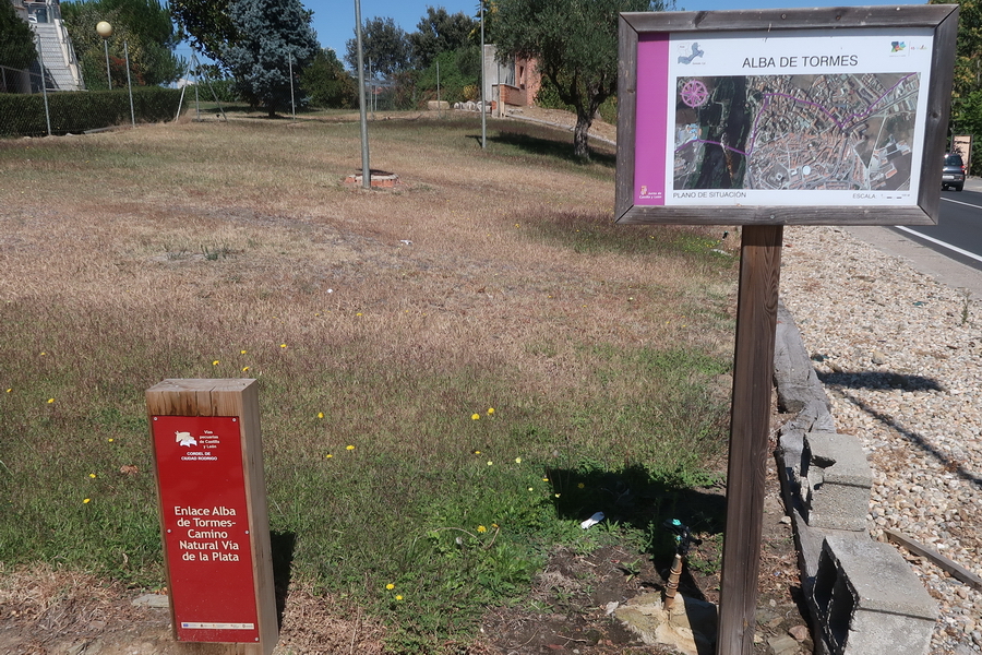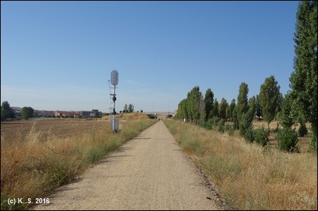 Wir starten an der großen Brücke über den Río Tormes - meist als Puente Romano bezeichnet. Der Fluss macht einen großen Bogen um das Gebirge herum, wir werden in Alba de Tormes wieder auf ihn treffen. Wegweiser zur Via Verde haben wir nicht entdeckt. Ein grüner Radweg führt am Flussufer entlang. Bereits nach knapp einem Kilometer in südwestlicher Richtung, an der Brücke Principe de Asturias (Kreisverkehr) muss man die Straße überqueren und der Straße Joaquin- Rodrigo folgen. Nach dem nächsten Kreisverkehr biegt man in die Calle Newton nach links ab und erreicht nach 350 m geradeaus den Beginn der Via Verde auf der Bahntrasse.