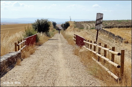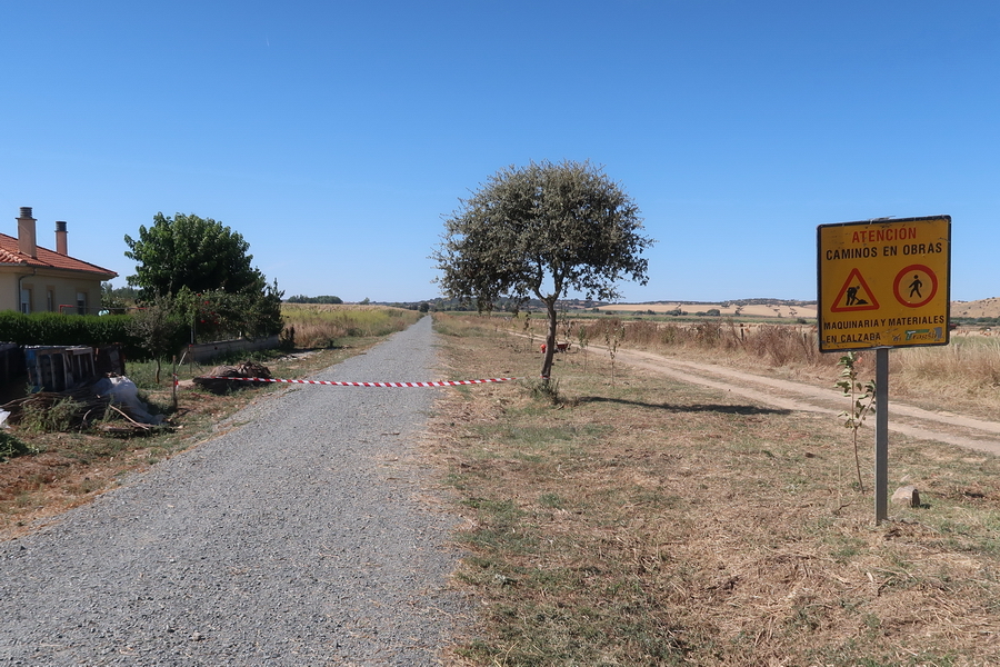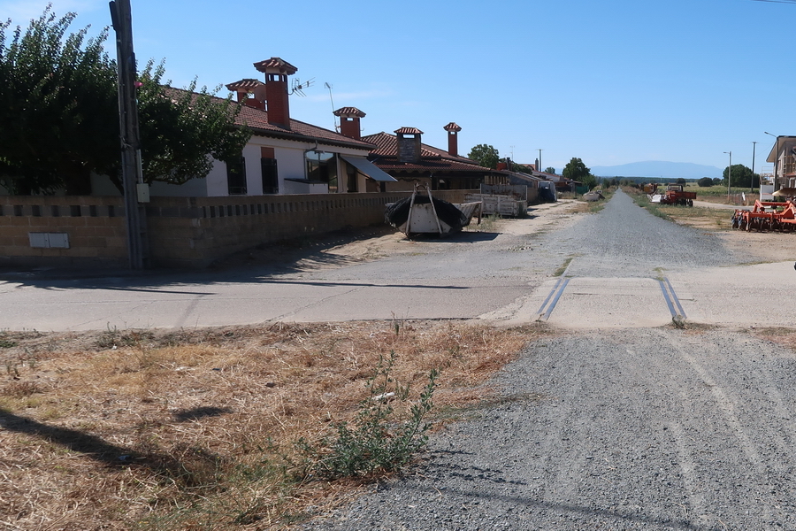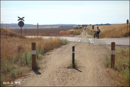 Die Bahntrasse verläuft direkt neben der Landstraße. In Encinas de Arriba, am Bahnübergang, liegen noch Gleisreste, in Sieteiglesias versperrt ein Plasikband den Durchgang.