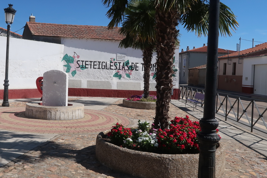 Ein hübsch gestalteter Platz in Sieteiglesias. Unbeschränkter Bahnübergang. Ojo al Tren! Das war einmal:
