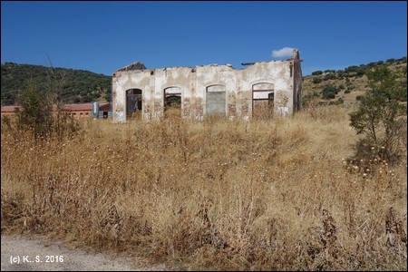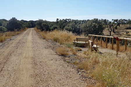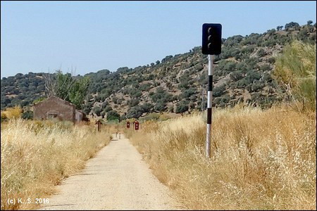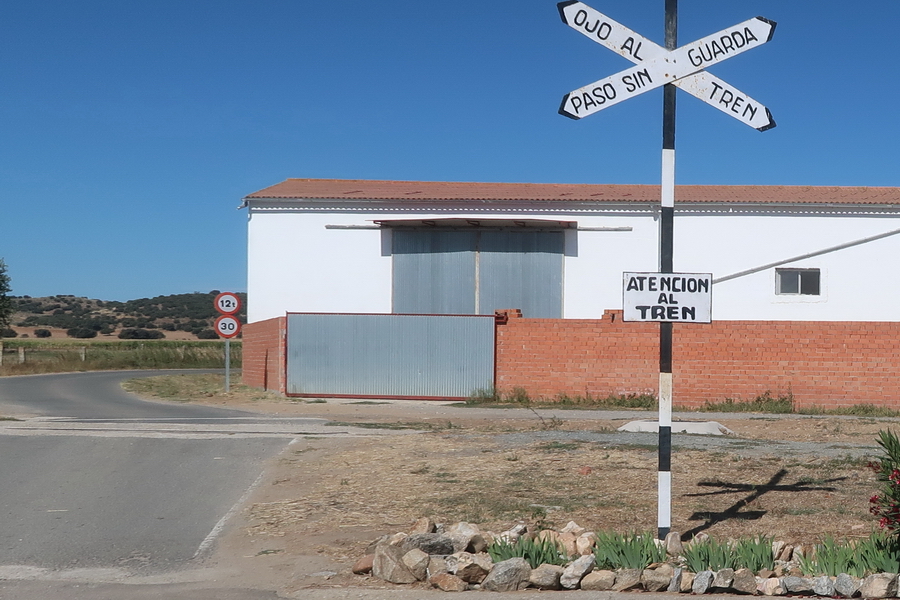 An der folgenden Straßenkreuzung liegen noch Schienenreste. Die Fahrt durch die Weidelandschaft der Dehesa beginnt.
