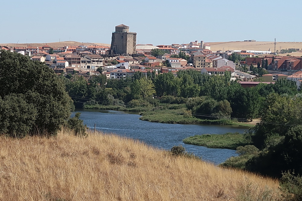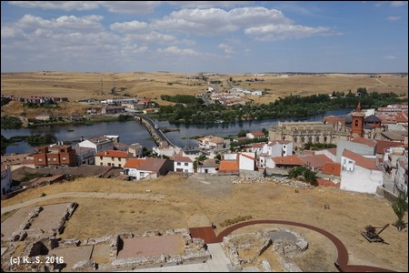 Blick auf Alba und den Fluss Tormes. Das vorläufige Ende des Ausbaus naht: Parkplatz beim Bahnhof Alba (Kilometer 20).