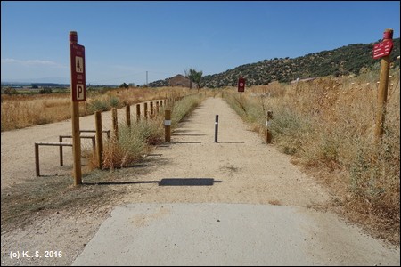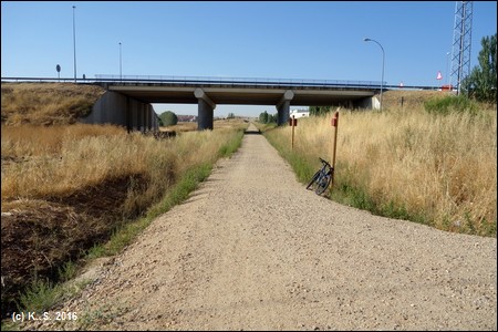 Unter der Brücke durch. Die Beschilderung der Strecke ist gut, Vorsicht an den Pfostensperren in Wegmitte (hier bei Carbajosa)