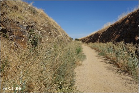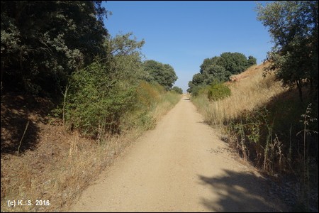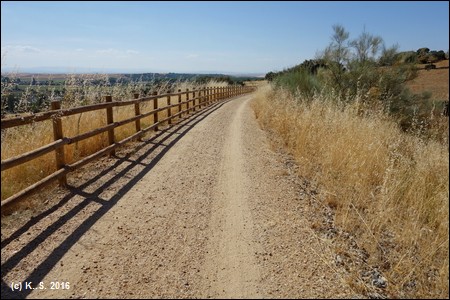 Die Vía Verde Ruta de la Plata (Camino Natural), wie der Radweg offiziell heißt, verläuft in Nord-Süd Richtung und folgt in groben Zügen dem alten Pilgerweg nach Santiago de Compostella (Jakobsweg). Die Bezeichnung "Plata" hat aber nichts mit dem Transport von Silber zu tun. Sie stammt wahrscheinlich vom maurischen Begriff für Plaster, denn die Strecke war einst von Sevilla bis nach Astorga vollständig gepflastert (Wikipedia.) Alle Abschnitte der Vía Verde de la Plata verlaufen fast vollständig auf der alten Bahntrasse, mit Ausnahme der überbauten Abschnitte (z.B. in den Städten).