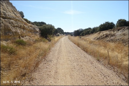 Die Strecke (20,2 /26 km): Der Radweg beginnt leider nicht direkt in Salamanca - obwohl die stillgelegte Bahnschleife nahe dem Fluss Tormes von der aktive Strecke abzweigt - sondern im etwa 2,5 km entfernten Industriegebiet vor Carbajosa de la Sagrada. Die Fahrbahn ist nicht asphaltiert, sondern besteht meist aus verfestigtem Kies/Splitt. Man fährt auf der Trasse, zunächst bergauf durch die schier endlosen Getreidefelder bis zu den Bergen von Arapiles, dem Schauplatz der Schlacht von Salamanca (Batalla de los Arapiles, 1812). Zwei Kilometer weiter aufwärts beginnen die Weidegebiete der Dehesa Charra mit ihren typischen Eichenbäumen. Die Bahntrasse durchquert in felsigen Einschnitten die einsame Landschaft. Die Kuppe der Strecke liegt bei Kilometer 16,3 in 925 m ü.NN. Nun geht es hinab zum Fluss, die Weiden gehen in Getreidefelder über. Der Ausblick reicht weit über die Flussebene bis zu den Bergen am Horizont. Etwa bei Kilometer 18 der Gesamtstrecke passiert man den Abzweig zum Ort Terradillos, der nur 500 m links neben der Strecke liegt. Nun erkennt man im Flusstal auch schon den Ort Alba de Tormes mit seinem mächtigen Burgturm, dem Rest der Burg der Herzöge von Alba. Nach 23 km vom Ausgangspunkt des Radwegs - davon 20,2 km auf der Bahnstrecke - erreicht man die Ruinen des Bahnhofs von Alba. Die Entfernung auf der Straße in den Ort beträgt noch einmal 3 km. Alba de Tormes (5.200 Einwohner) war ein bedeutsamer Ort, vor allem im 16. Jahrhundert.
