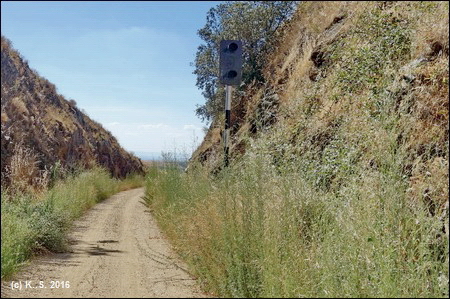 In der Felsenschlucht ein altes Signal. Weiter ins Tal, neue Geländer sichern den Trassenrand.