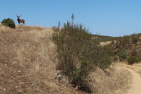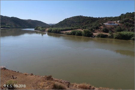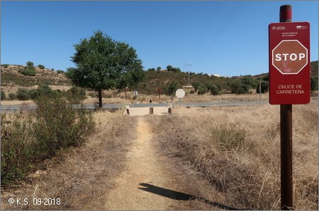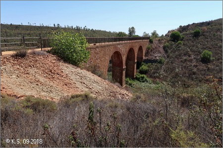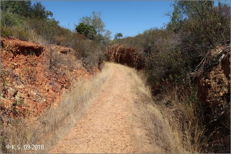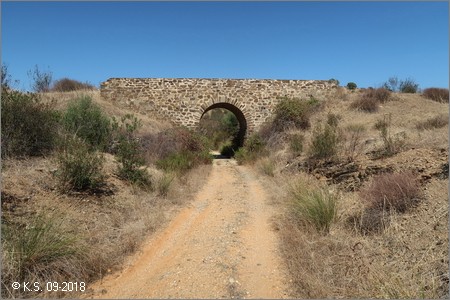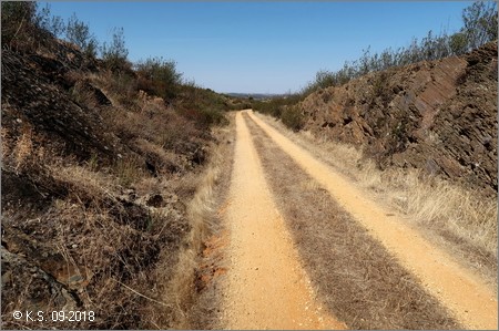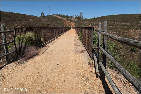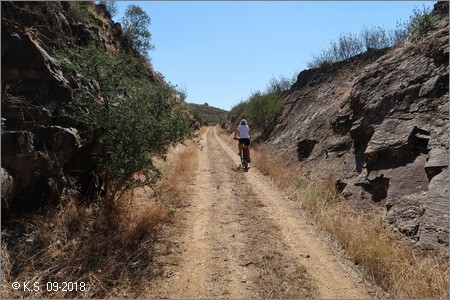 Von den Verladerampen aus folgt man der alten Bahntrasse zu einem Rastplatz am Hang oberhalb des Río Guadiana. Die schmale Trasse wurde aus dem Felshang gehauen, man blickt weit hinab über den Fluss.
