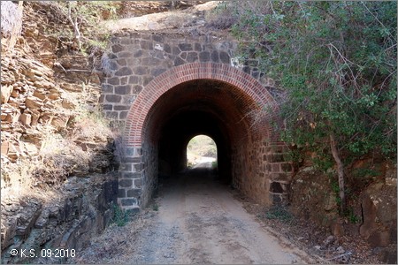 Schon nach einem Kilometer erscheint der erste und einzige Tunnel dieser Strecke. Ein schön gemauertes Portal ziert die Einfahrt in diese kurze, unbeleuchtete Röhre.