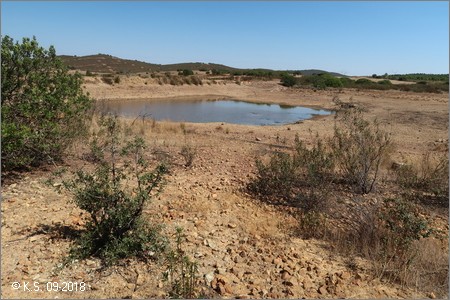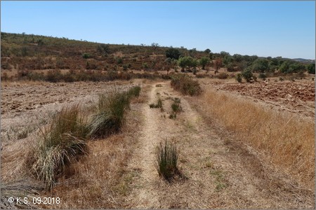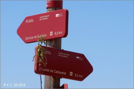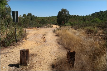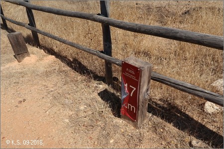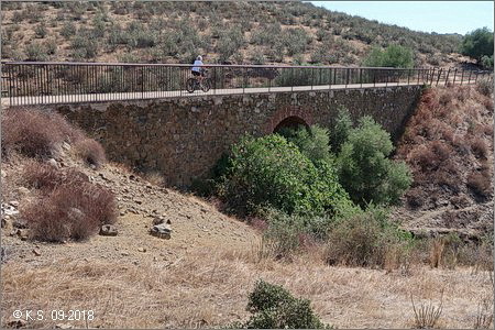 Kilometer 17, das Schild ist beschädigt. Die Infotafel ist nicht mehr lesbar, eine weiter Tafel erklärt einen Abschnitt des Guadiana-Wanderwegs. Dieses enttäuschende Ende der Vía Verde hatten wir nicht erwartet. Die Häuser der kleinen Ansiedlung sind wohl Ferienhäuser, ansonsten gibt es hier nichts. Wir machen uns auf den Rückweg ins Tal des Guadiana, es ist heiß hier wie im Backofen. Nach dem kurzen Anstieg zum Bahnhof El Sardón geht es zum Glück nur noch bergab!