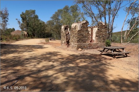 Bei Kilometer 10,8 erreicht man den einzigen Bahnhof der Strecke. Wo sich einst eine Ansiedlung der Minenarbeiter befand, findet man heute nur noch eine Ruinenlandschaft vor. Hier, in einer Höhe von knapp 200 Metern über dem Meer, befindet sich auch der Scheitelpunkt des Radwegs. Auf dem etwas vernachlässigten Rastplatz am ehemaligen Bahnhofsgelände gibt es Schatten unter den großen Eukalyptusbäumen.