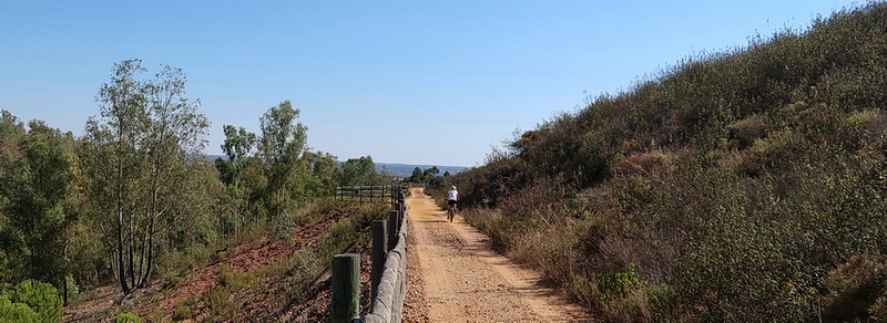 Der kurze Radweg führt durch die einsame südwestspanische Landschaft an der Grenze zu Portugal und bietet im ersten Abschnitt am Steilhang des Guadiana grandiose Ausblicke in das Flusstal. Tiefe Einschnitte mussten zum Bau der Schmalspurstrecke aus den Felsen gehauen werden, auch ein kurzer Tunnel war notwendig. Weiter in die Berge dominiert eine karge Landschaft: Unzählige Zistrosenbüsche verströmen im Sommer einen unverkennbaren, süßlichen Duft aus dem klebrigen Saft, während sie im Frühjahr die Landschaft in ein Blütenmeer verwandeln. Im oberen Abschnitt durchquert man einen Bereich mit Eukalyptusbäumen, danach eine karge Weidelandschaft (Llanos) mit einzelstehenden Steineichen (Encinas).