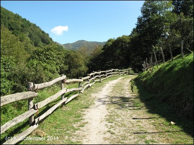 Hier findet man auch wieder Wegweiser. Zunächst verläuft der Weg noch eben am Hang entlang....