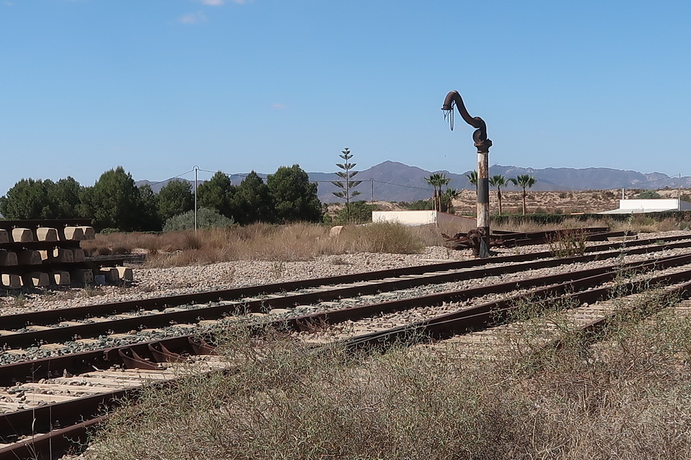 Recht ungepflegt führt die Trasse weiter Richtung Huercal-Overa. An der Kreuzung mit der Straße nach Las Norias liegen noch die Schienen in einem Holzbett.