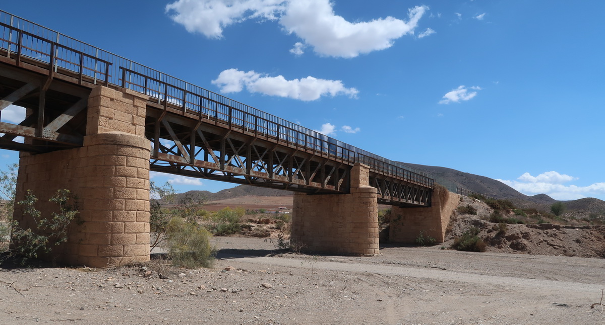 Die 72 m lange Brücke hat die Zeit des Eisenerztransportes überdauert, schon 1965 endete der Abbau in Las Norias.
