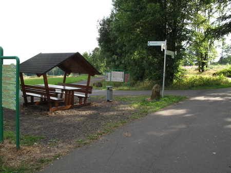 In einer Zick-Zack-Fahrt durch die Heidelandschaft. 2,2 km vor Radmühl gibt es wieder einen Rastplatz mit Schutzdach. Die Strecke biegt links ab.
