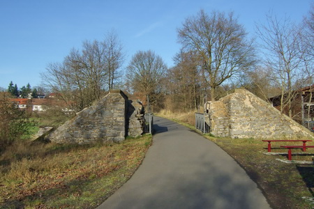 Die Brücke über den Mühlbach in Gedern ist ein kurioses Bauwerk (Blick zurück). Der Vulkanradweg bietet nun zwei Optionen; die Schlossroute oder die Hauptroute. Alles ist sehr ordentlich ausgeschildert.