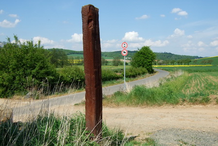 Aus dem Waldgebiet heraus auf dem Bergrücken entlang hat man einen fantastischen Weitblick - so heißt auch diese eiserne Stele, eine von 13 aus Eisen gegossene Stelen entlang des Radwegs. Die Tafel mit dem schematischen Streckenverlauf und der Bedeutung der Objekte ist inzwischen verschwunden. Kurz darauf erreicht man Ober-Seemen. Hier gab es bis vor kurzem noch eine Umleitung durch den Ort.