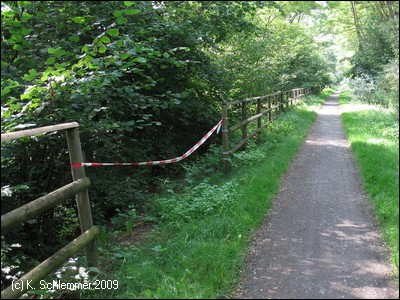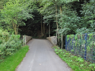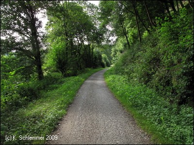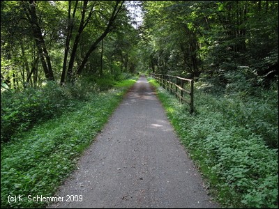 Nur ein kurzes Stück ist asphaltiert, dann wird`s ein Waldweg. Auch die Bahntrasse hat die Weil überquert, die alte Brücke ist durch das Gestrüpp zu sehen. Wir sind nun auf der Bahntrasse.