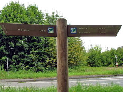 Die L3323 muss überquert werden, dann tauchen die Wegweiser des Weiltalwegs auf. Die nicht normgerechten Schilder sind teils schlecht lesbar, besonders ohne anzuhalten. Das einheitliche Logo hilft bei der Orientierung.