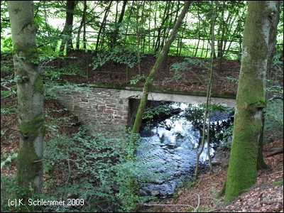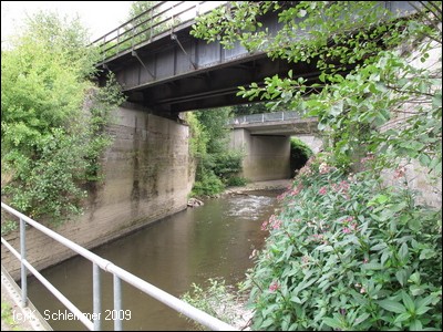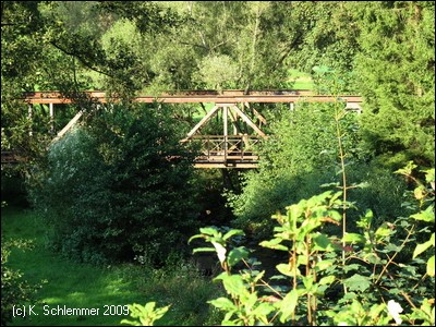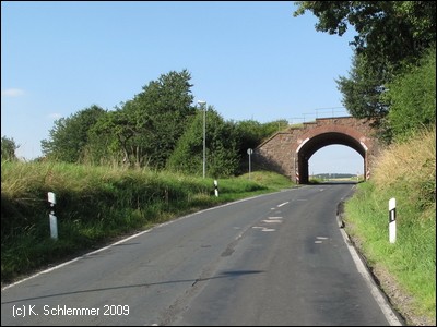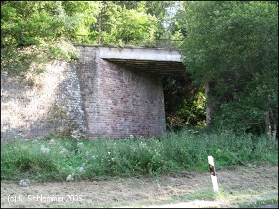 Richtung Ernste Mühle entlang der Straße geht es an einer alten Brücke der Bahnstrecke vorbei.