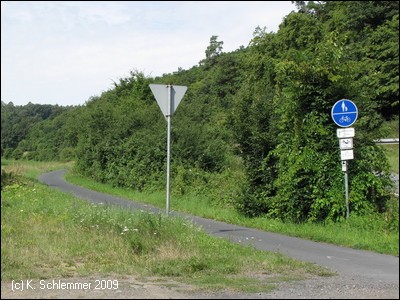 Bis zum Freibad ist der Radweg breit ausgebaut und asphaltiert. Die Schilder sind in die Jahre gekommen.