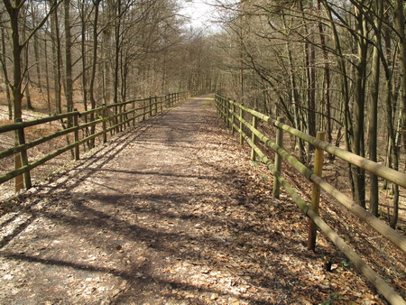 Weiter geht die Talfahrt. Am Ende des Waldgebiets hat man einen weiten Blick. Dann taucht der Radweg wieder in den Wald ein. Die Holzgeländer sind schon lange marode.