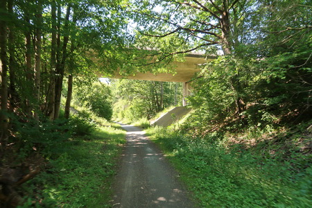 Nun wechselt der Radweg wieder auf die Bahntrasse. Die Autobahnbrücke der A45 überquert das Ambachtal (km 2,9).