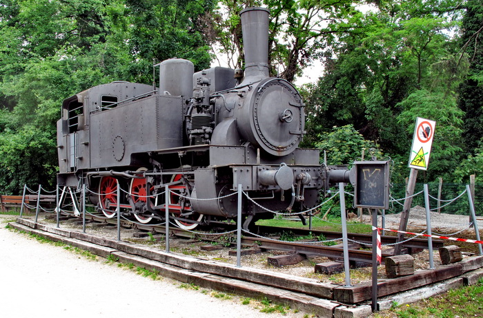 Schnell erreicht man das Ende der Strecke am Ortsrand von Kaltern. Hier steht eine alte Dampflok.