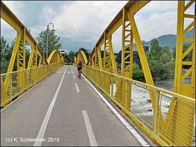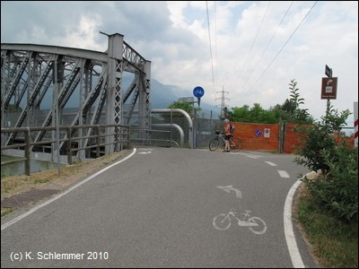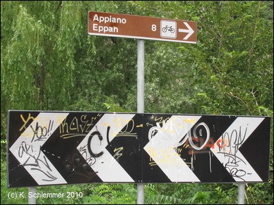 Wenn man aus nördlicher Richtung an der Eisack entlang nach Bozen fährt, ist der Radweg nach Eppan bereits ausgeschildert. Man fährt am Bahnhof Bozen vorbei und folgt dem Fluss abwärts bis zur alten Eisenbahnbrücke über die Talfer.