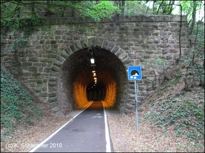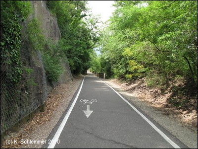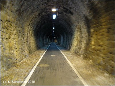 Der Radweg ist gut ausgebaut und asphaltiert, zwei beleuchtete Tunnel sind befahrbar.