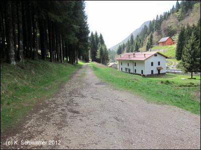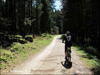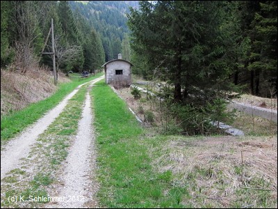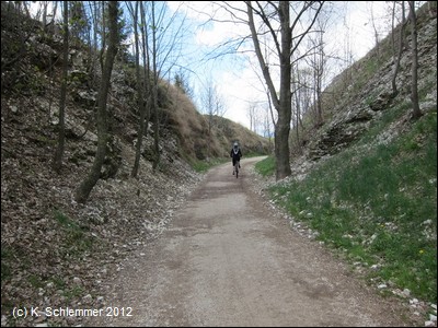 Die offizielle Strecke endet hier (Blick zurück). Aber der Waldweg auf der Trasse führt weiter talwärts.