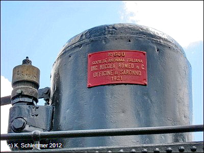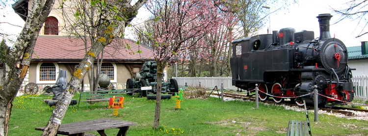 Einfahrt zum Bahnhof Canove. Eine "ortsfremde" Dampflok steht vor dem alten Gebäude unter freiem Himmel. Das Bahnhofsgebäude wurde zum Kriegsmuseum umfunktioniert.
