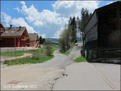Es geht nun leicht bergab aus dem Ort heraus. Ein paar Straßen kreuzen den Radweg, der einmal asphaltiert, dann wieder ein Feldweg ist.