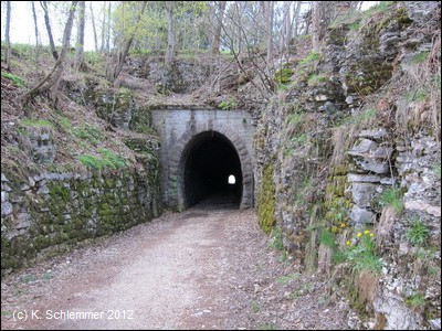 Vorsicht! Keine Beleuchtung. Blick zurück auf das Westportal des Tunnels.