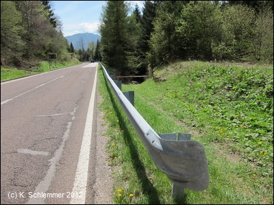 Jenseits der Straße führt die Trasse weiter steil abwärts durch den Wald. Wir beenden hier (vorerst) unsere Fahrt auf der Strada del Trenino...