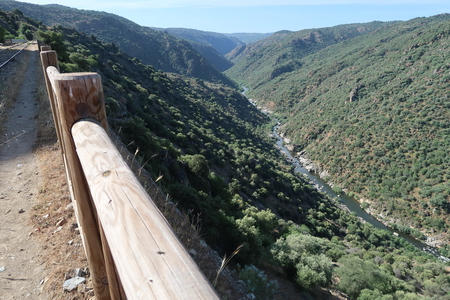 Vorbei an einer Viehweide und durch einen tiefen Felseinschnitt folgt man der Trasse, die hier eng am Steilhang verläuft und durch ein Geländer gesichert ist. Tief unten im Tal hat sich der Grenzfluss Río Àgueda sein Bett in die Felsen gegraben.